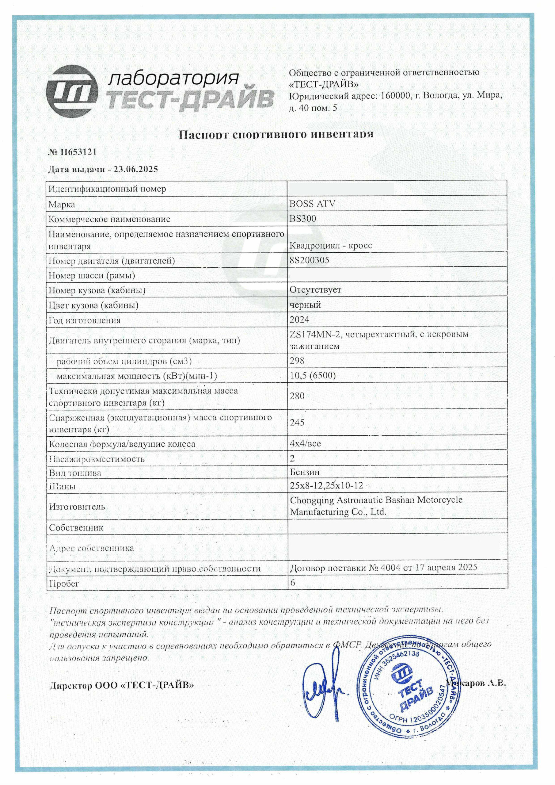 Свидетельство на спортинвентарь — это неофициальный, но юридически значимый документ, подтверждающий ваше право собственности на технику, которая не подлежит государственной регистрации (питбайки, кроссовые мотоциклы, багги и т. д.). В нем указываются: