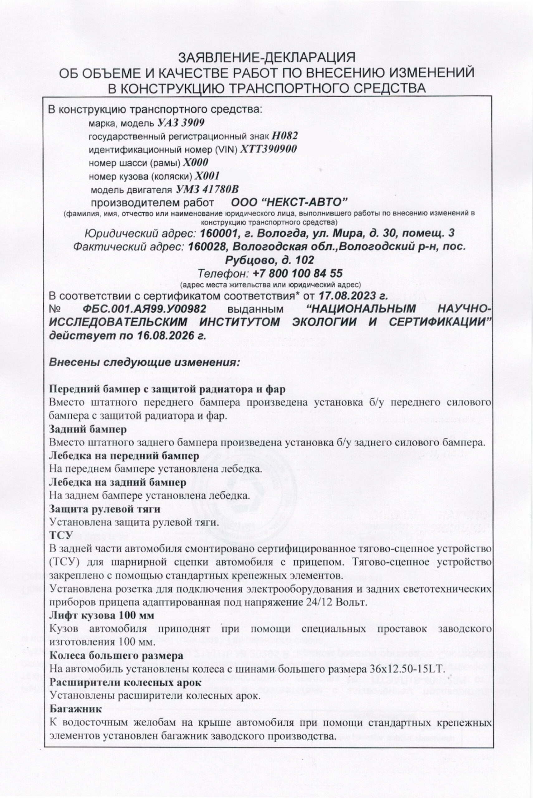 Заявление-декларация на переоборудование оформляется в соответствии с требованиями законодательных норм. В противном случае в легализации вносимых изменений будет отказано. В нем подробно описывается конфигурация автомобиля после доработок в сертифицированном СТО, полное описание всех проделанных работ, а также марка, модель ТС, тип, цвет, регистрационный знак, VIN, кузов, наличие прицепа и другие данные. К документу прикладывается копия сертификата сервиса с указанием расшифровки кодов и услуг.